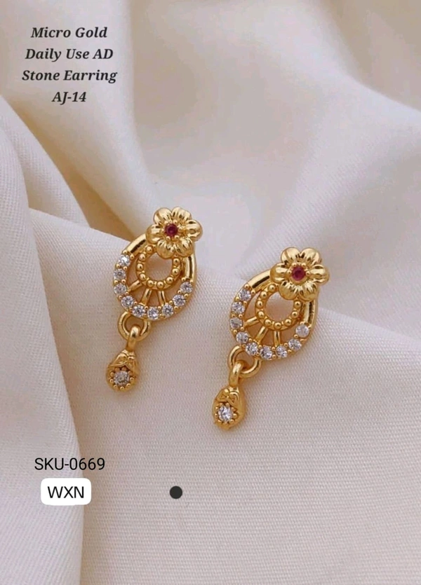 Made from premium brass and coated with micro gold plating, these earrings offer a real gold-like finish and long-lasting durability. The sparkling American Diamonds (AD stones) and a tiny ruby center add a sophisticated touch that’s perfect for both daily wear and festive occasions.