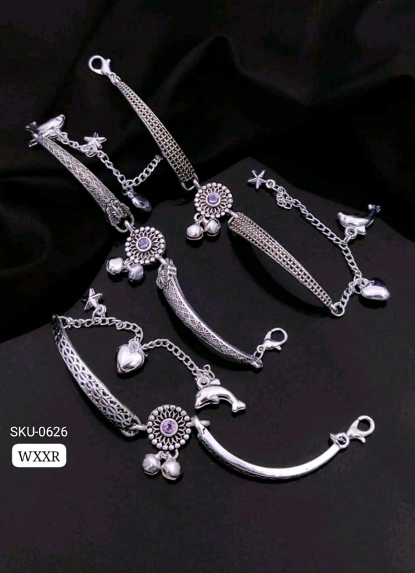 Each bracelet is beautifully handcrafted with intricate oxidised silver detailing, featuring delicate motifs like hearts, dolphins, bells, and star charms, giving a perfect fusion of ethnic and trendy fashion.