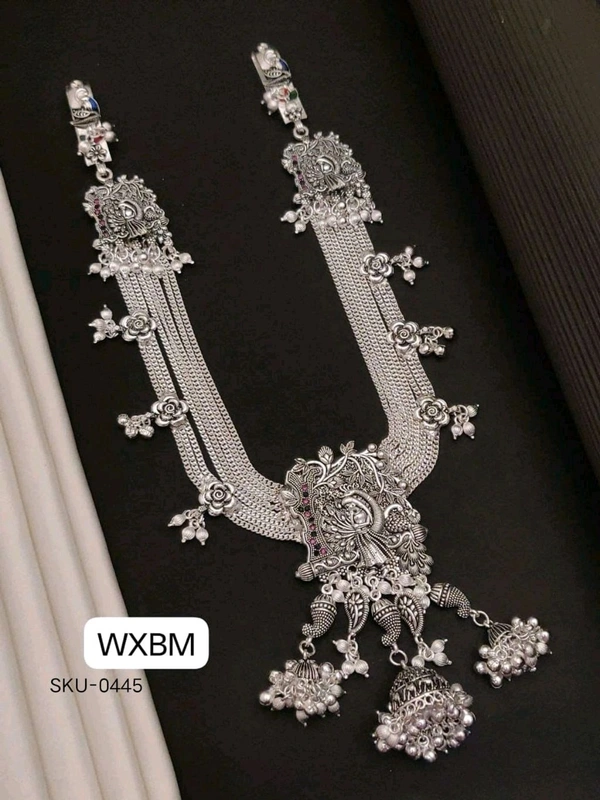 The central pendant showcases fine temple-style detailing, surrounded by delicate oxidised work, tiny ghungroo dangles, and floral embellishments for a majestic finish.