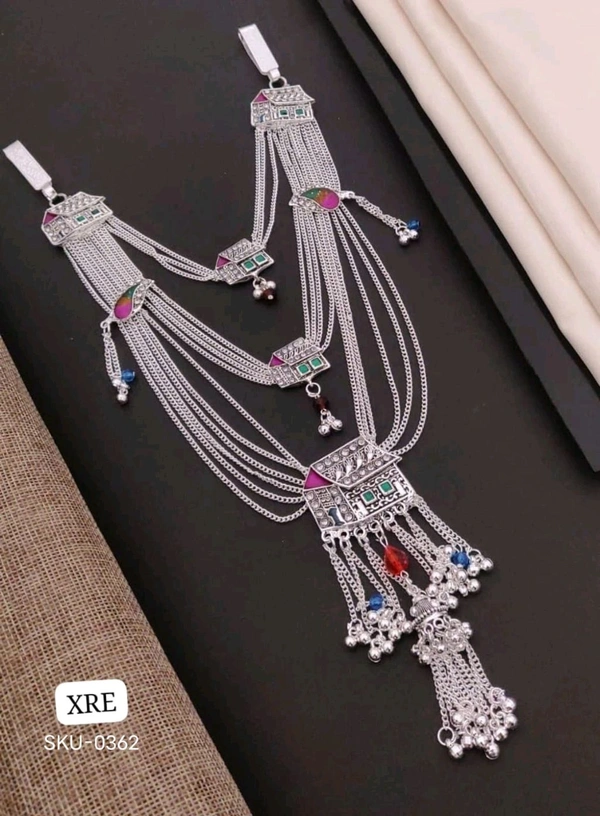 Add a royal touch to your ethnic look with this elegant Fancy Silver Oxidised Kandora from KANAF. Crafted with intricate detailing, this designer piece features multi-layer silver chains adorned with diamond-cut stones and colourful embellishments that create a luxurious, statement-making appearance. Perfect for enhancing sarees, lehengas, and traditional outfits, this kandora beautifully combines traditional artistry with modern sparkle.
