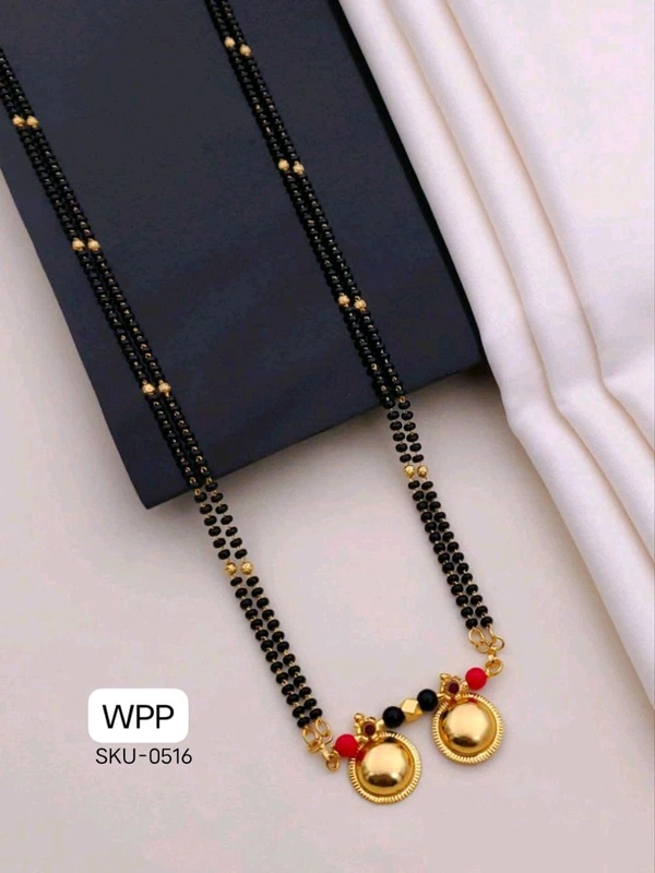 This piece features a classic double-line black bead chain paired with vibrant red and golden accent beads, leading to a stunning dual dome pendant design that radiates traditional charm.