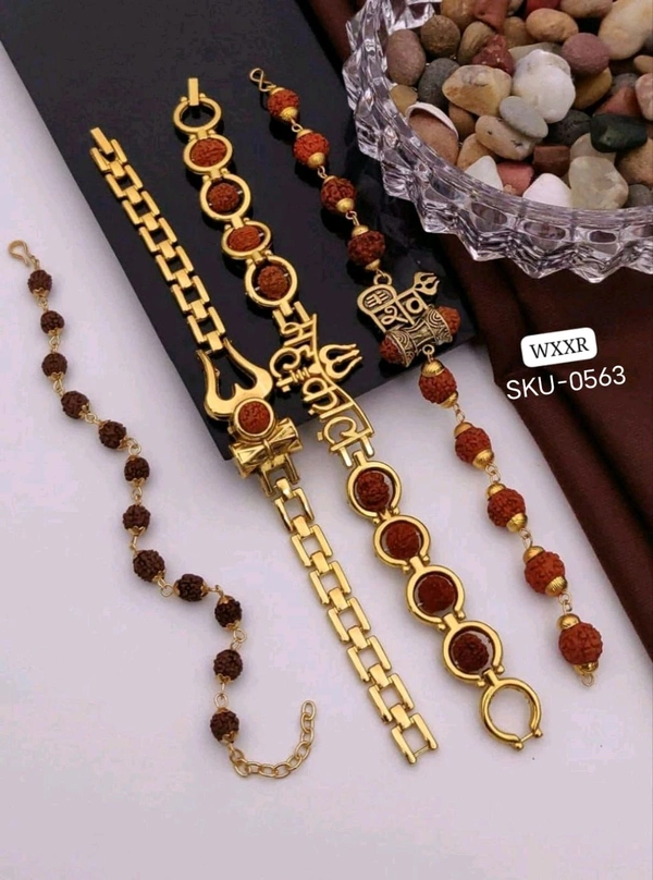 Each bracelet is designed with a blend of spiritual symbolism and modern fashion, featuring real-look Rudraksha beads, gold-forming polish, and detailed engravings like ‘Mahakal’ and Trishul symbols.